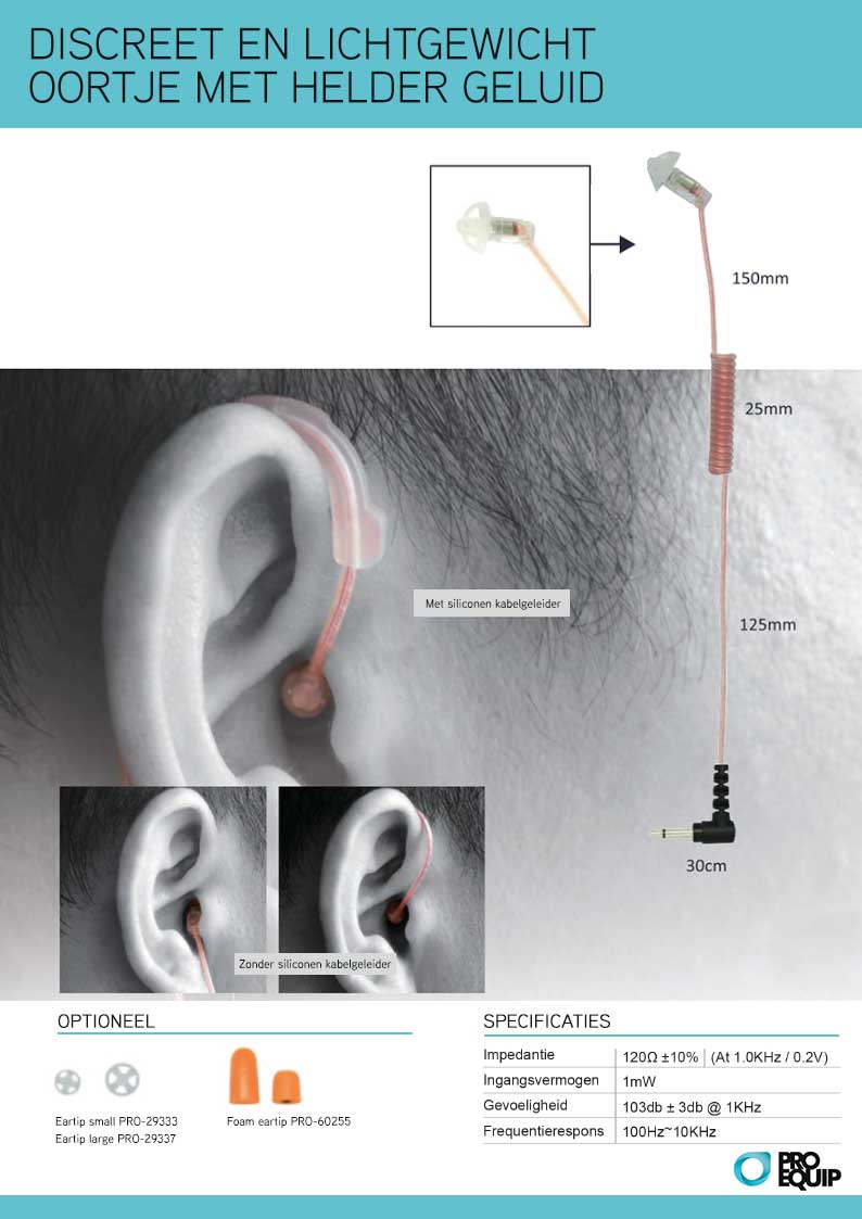 Dit oortje is geschikt voor verschillende (beroeps)toepassingen waarbij discretie essentieel is. Denk aan TV presentatoren, (persoons)beveiliging of horeca.
